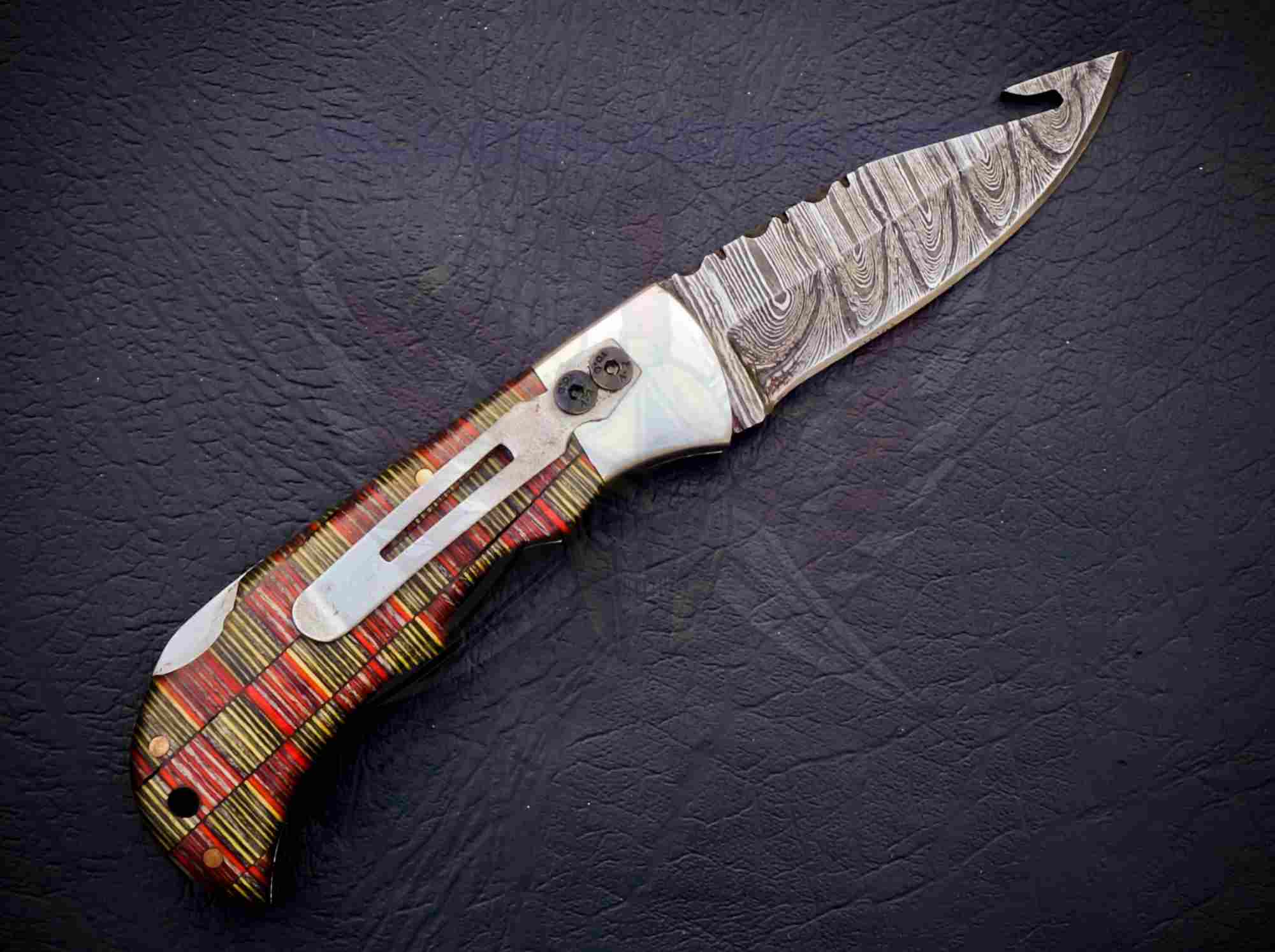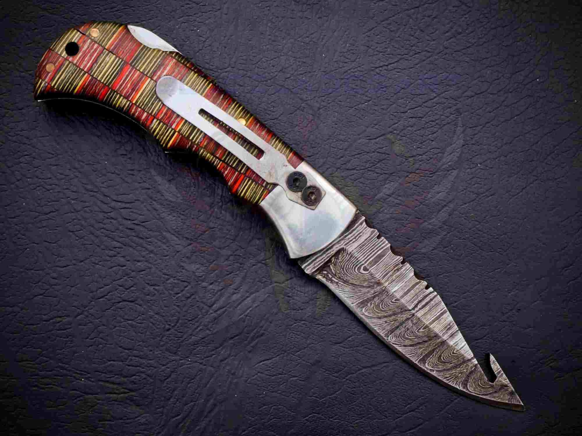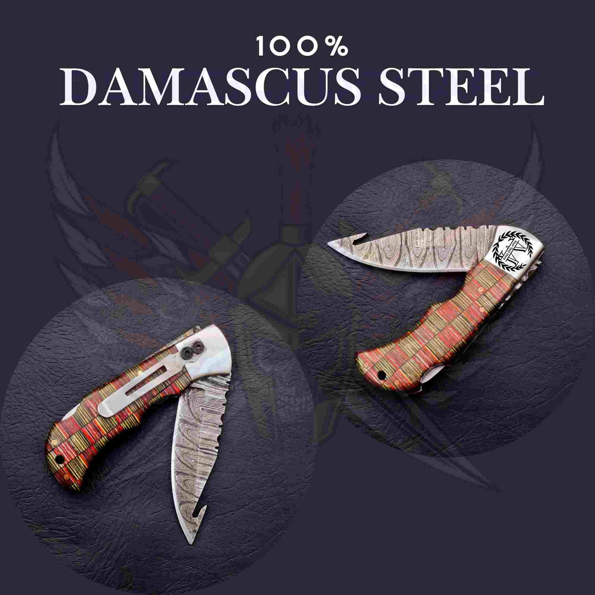 Handmade Crimson Grain Damascus Foldable Pocket Knife featuring a real Damascus steel blade with a built-in gut hook and a striking red-and-gold striped handle.