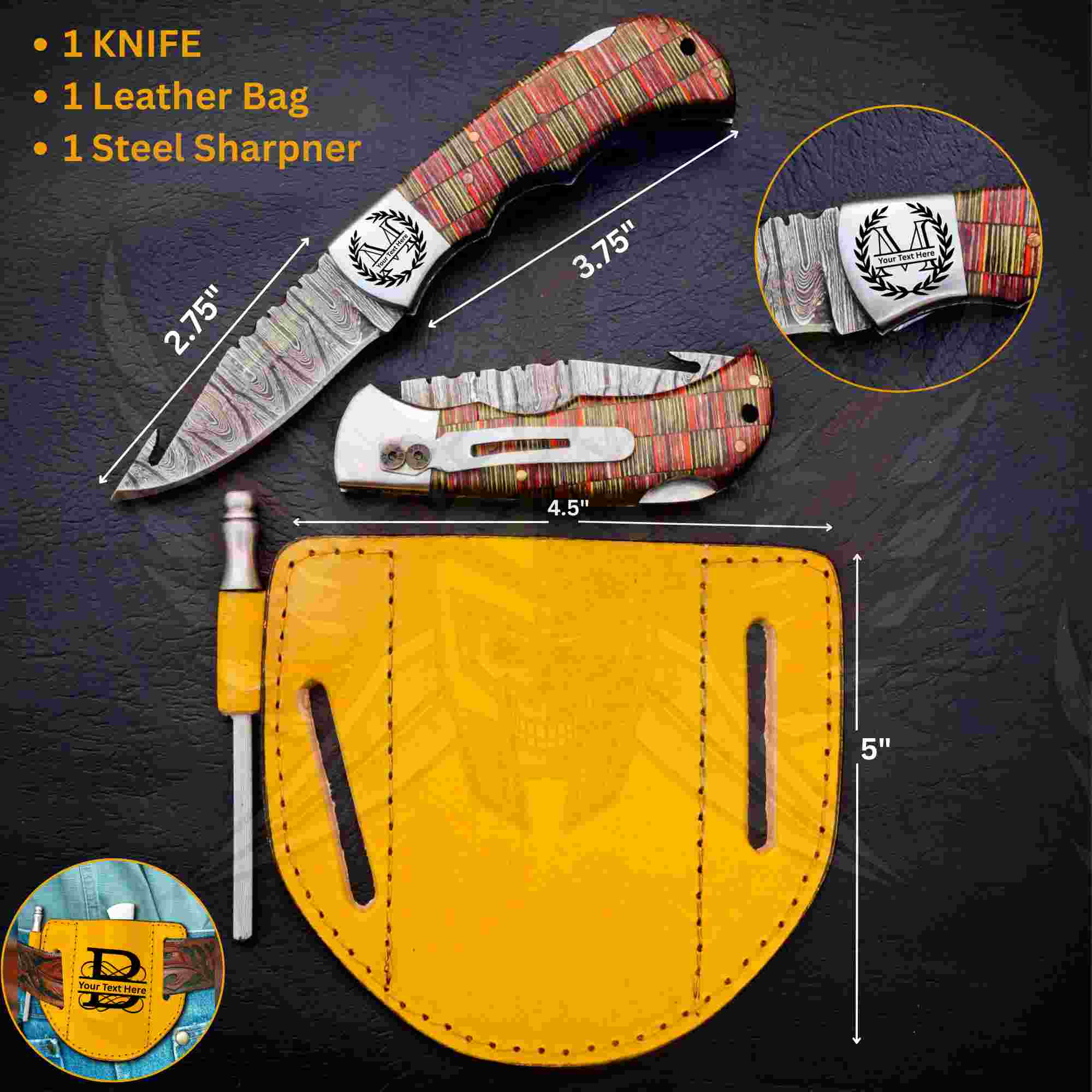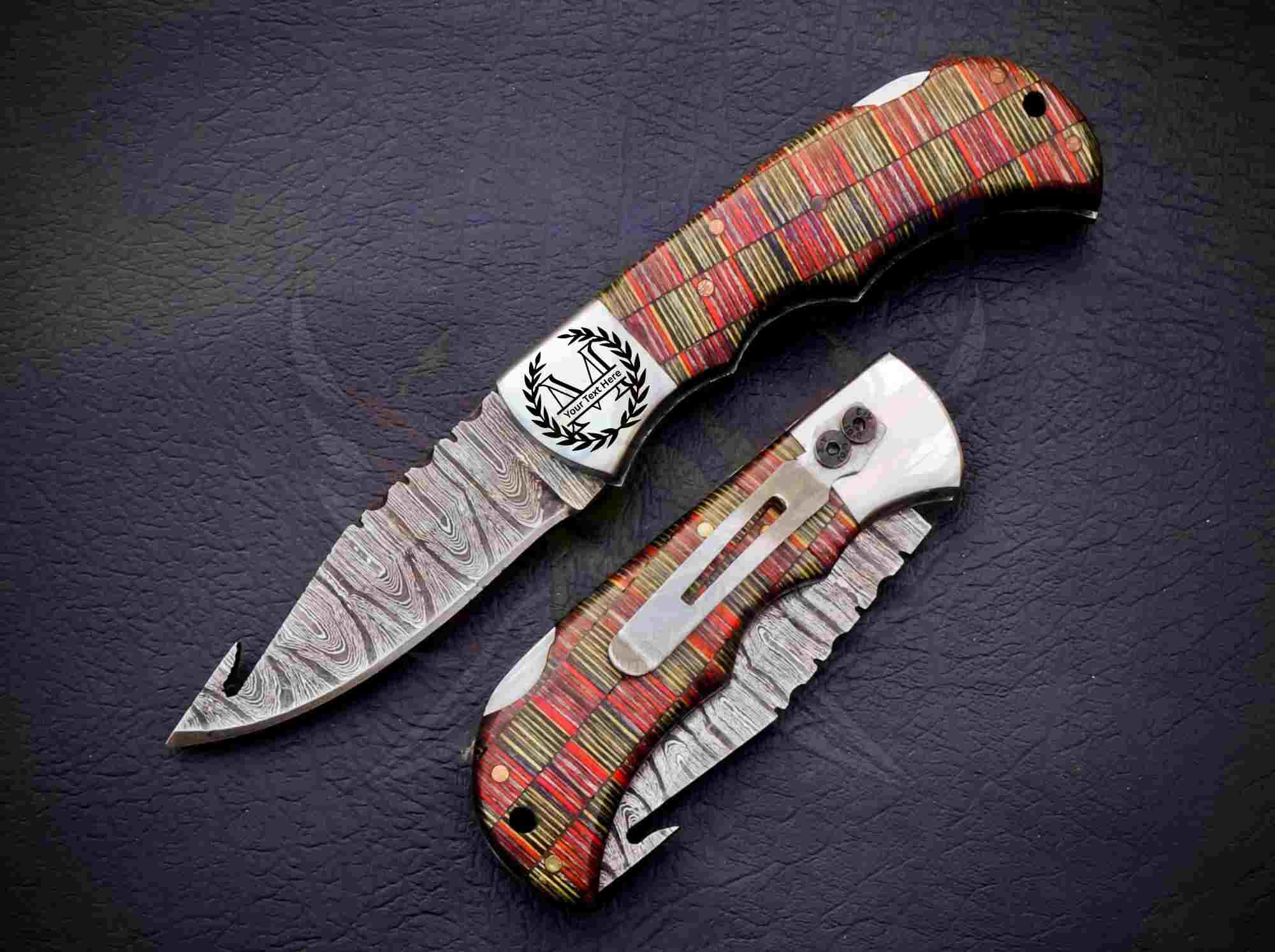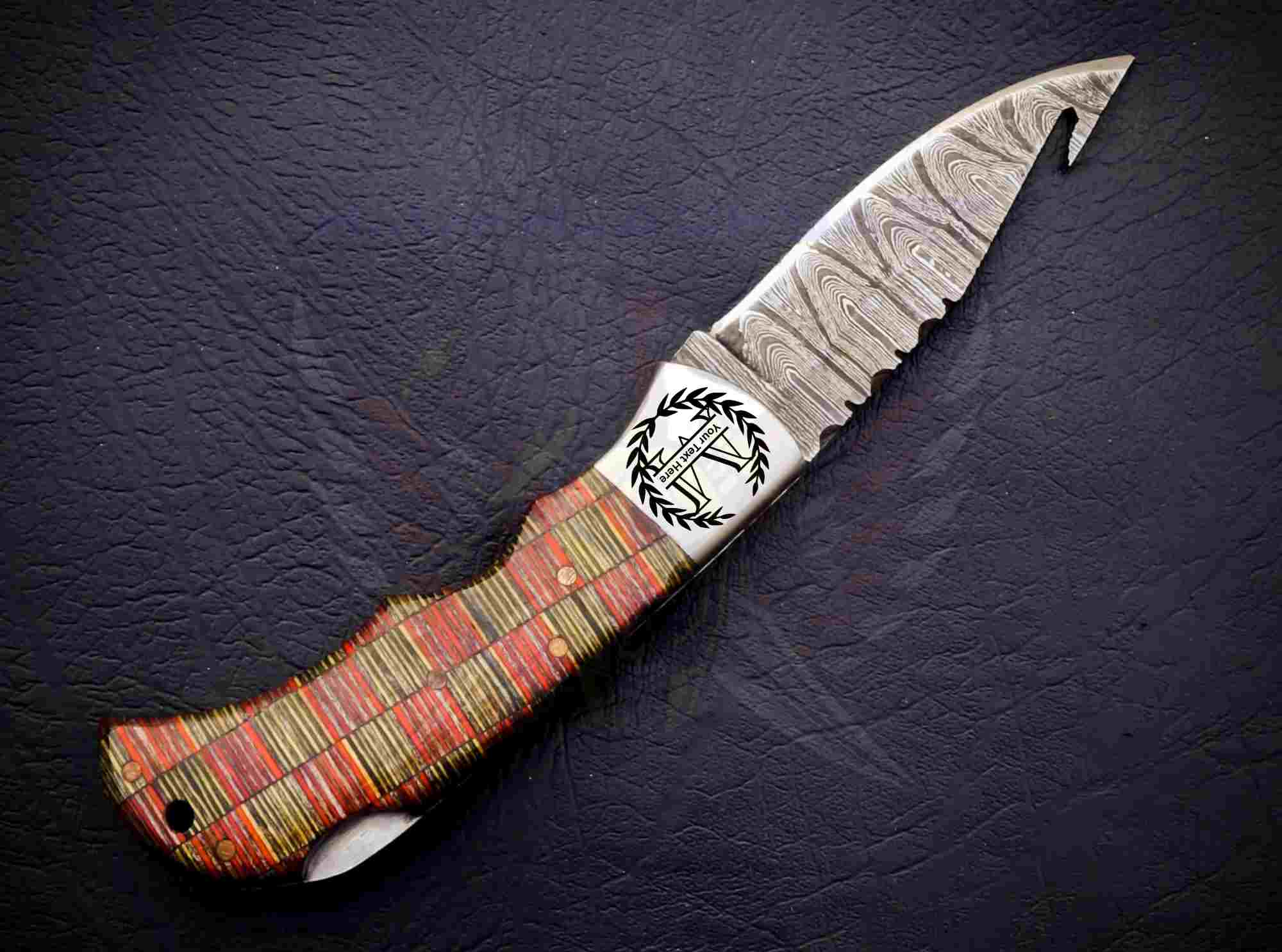 Handmade Crimson Grain Damascus Foldable Pocket Knife featuring a real Damascus steel blade with a built-in gut hook and a striking red-and-gold striped handle.