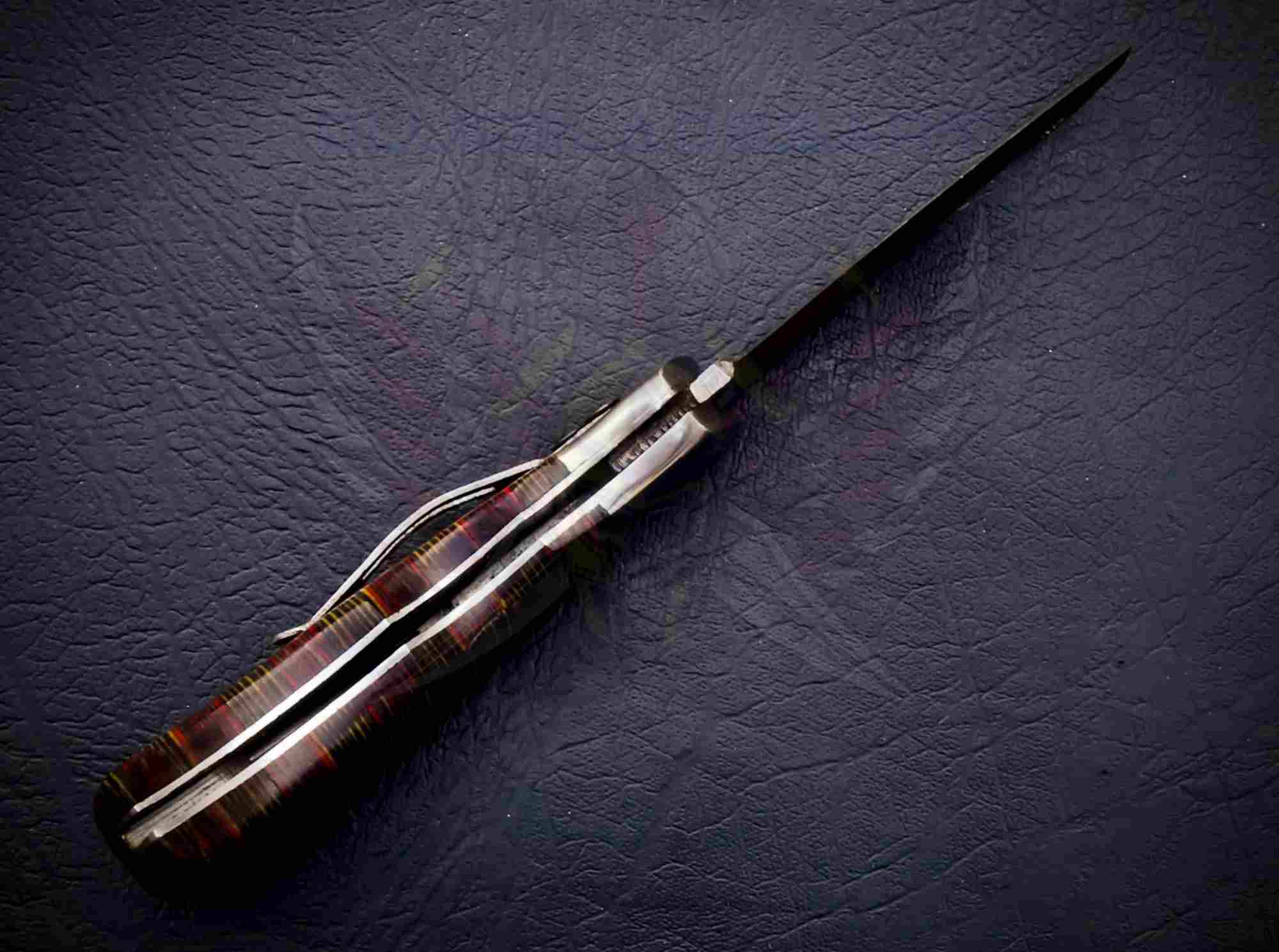 The Crimson Grain Damascus Foldable Pocket Knife is a handcrafted, compact outdoor and everyday carry knife designed with both beauty and performance in mind. The blade is forged from real 1095 & 15N20 Damascus steel, showing bold ripple patterns and excellent edge strength.