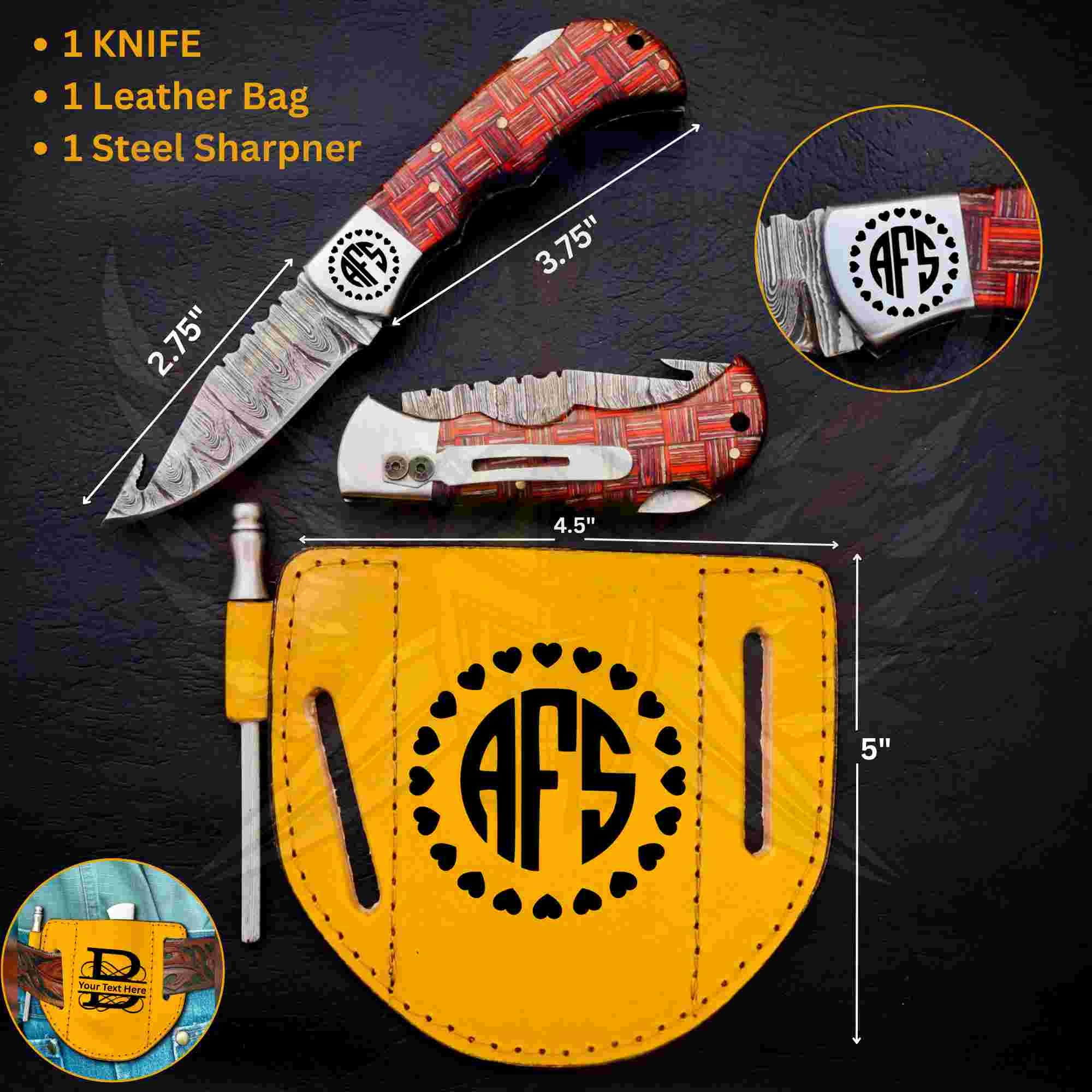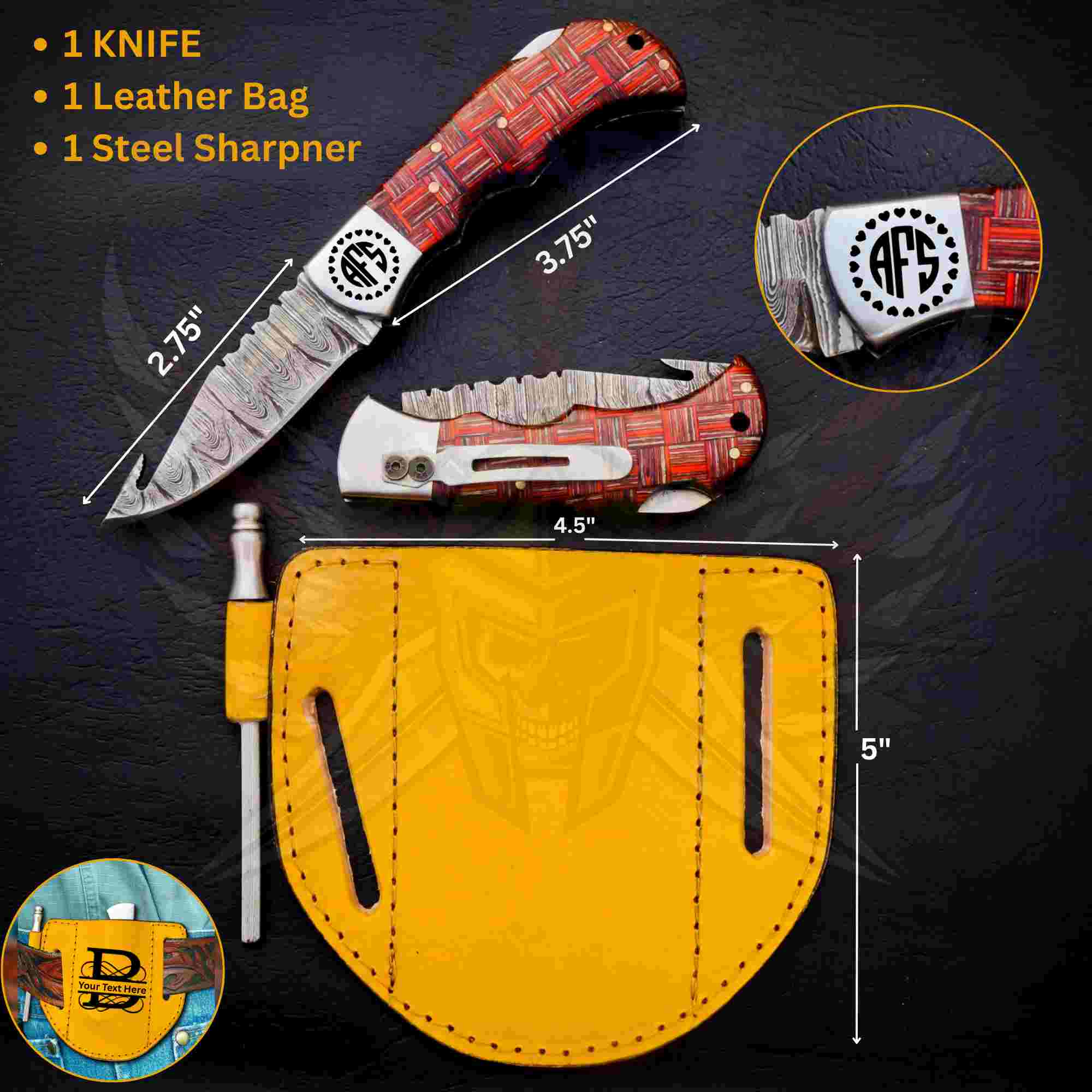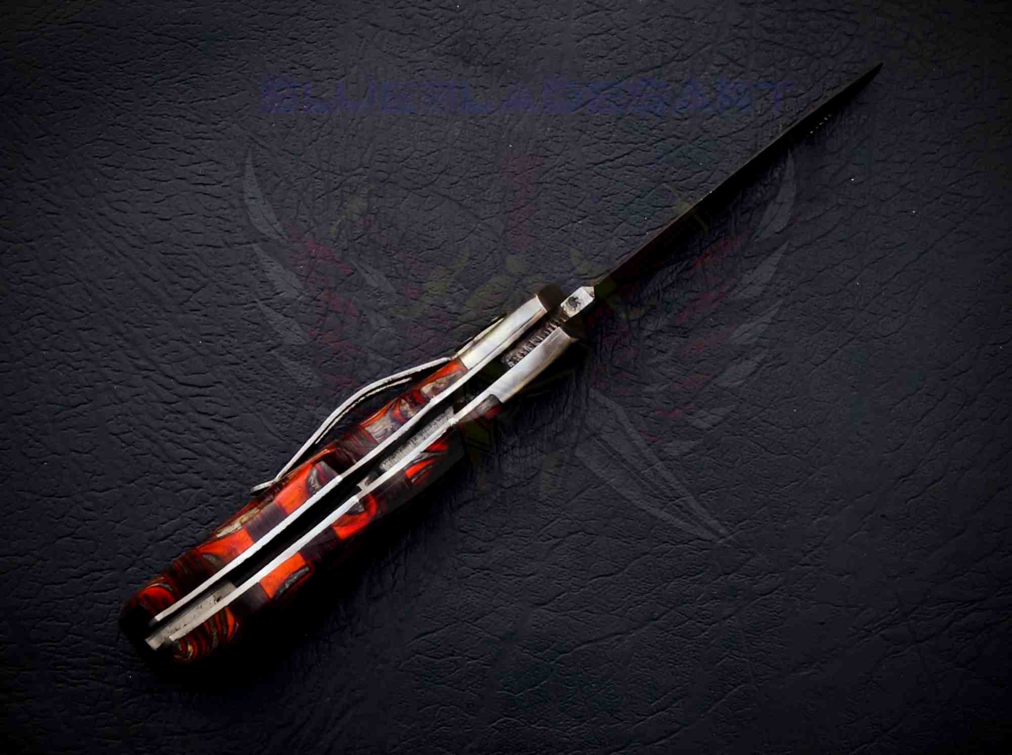 The Redshear Damascus Foldable Pocket Knife is a handcrafted, compact knife designed for outdoor use, hunting, everyday carry, and collectors. The blade is forged from real 1095 & 15N20 Damascus steel, showing bold layered patterns for strength, sharpness, and long-lasting performance.