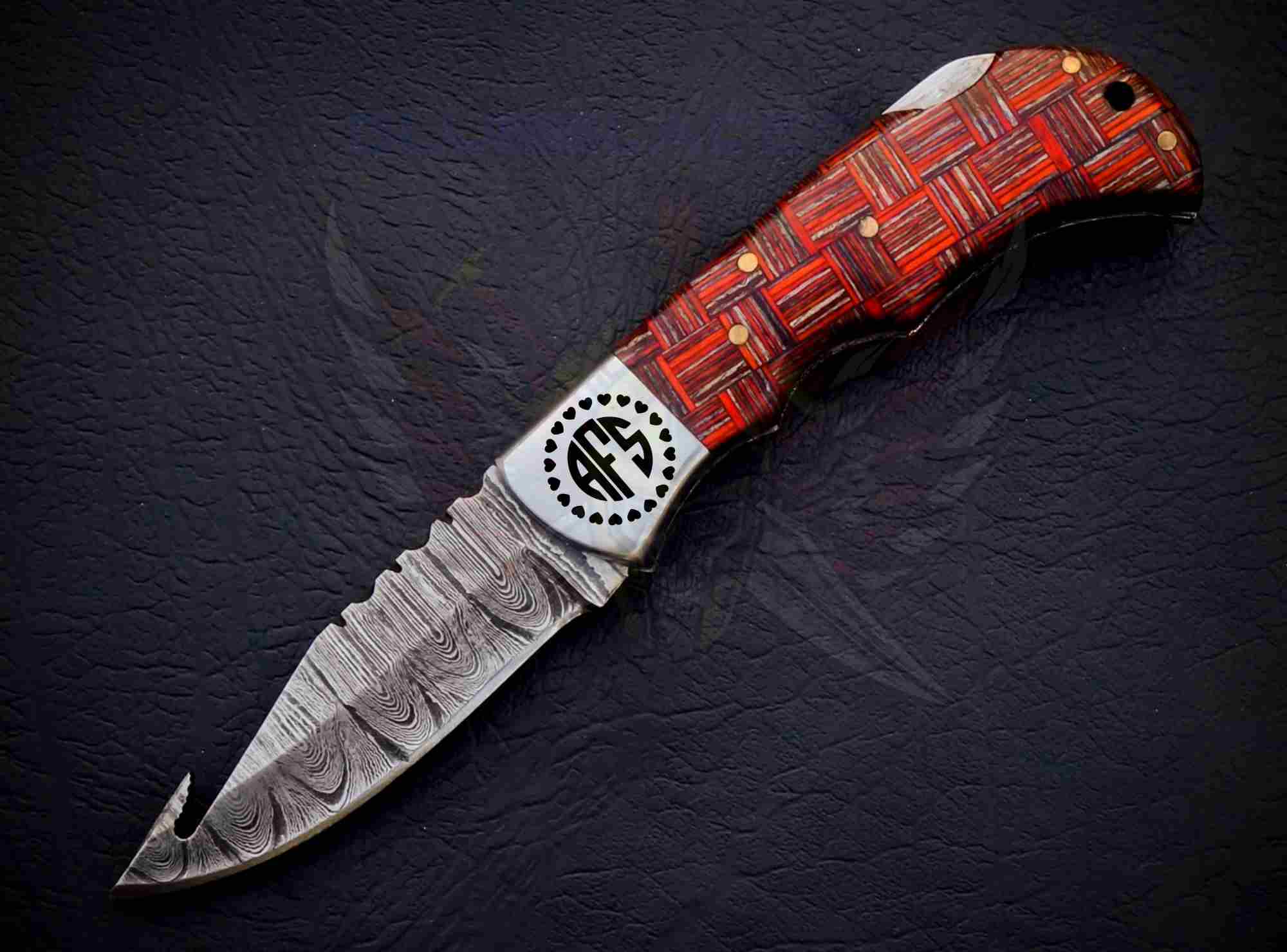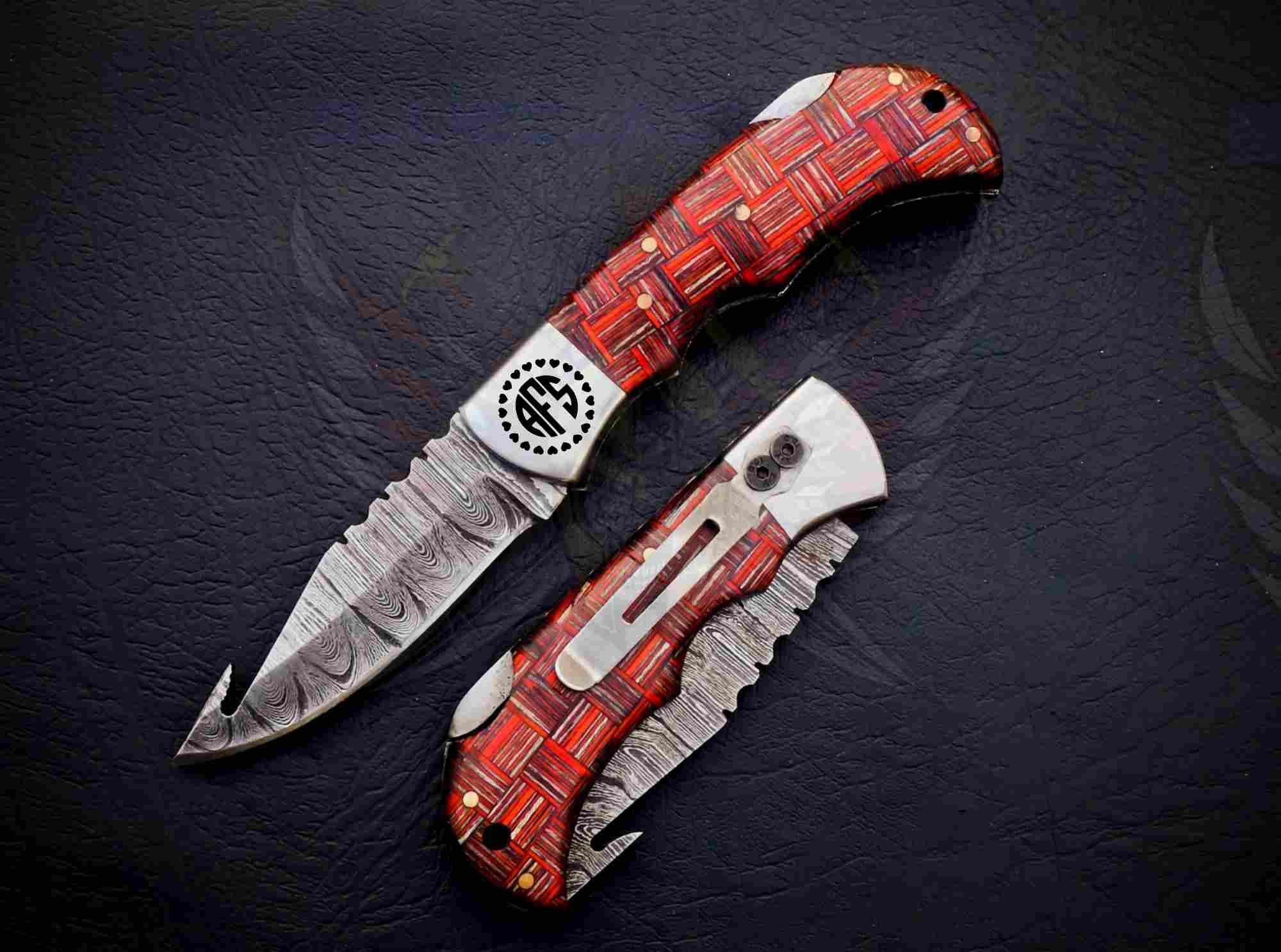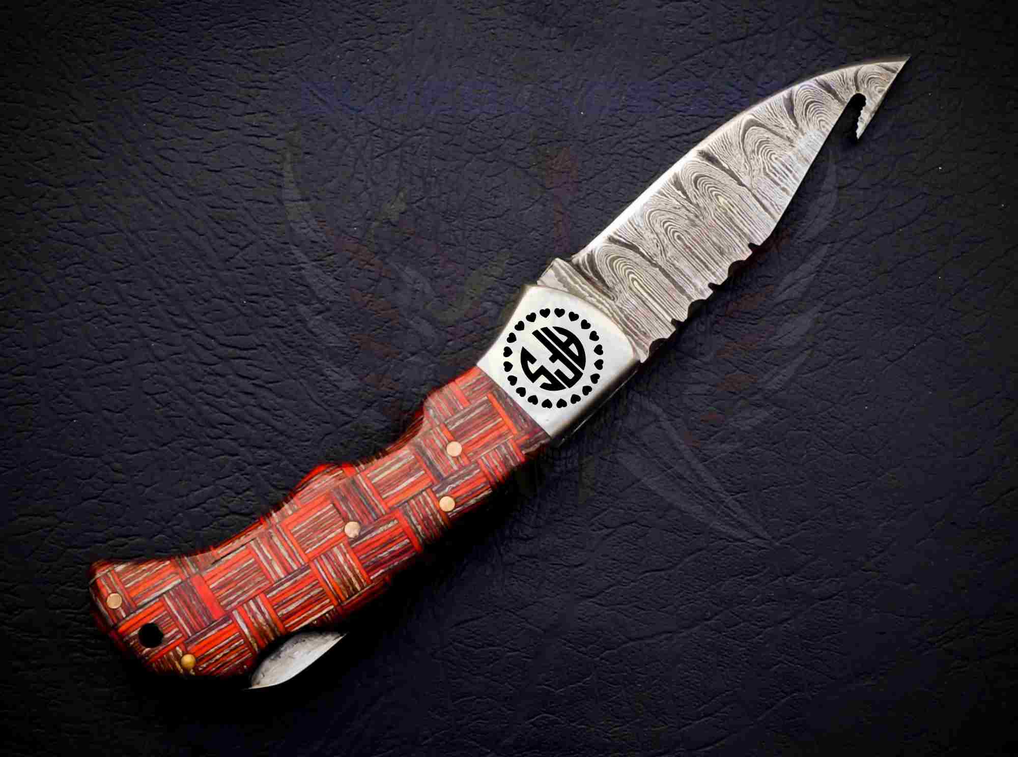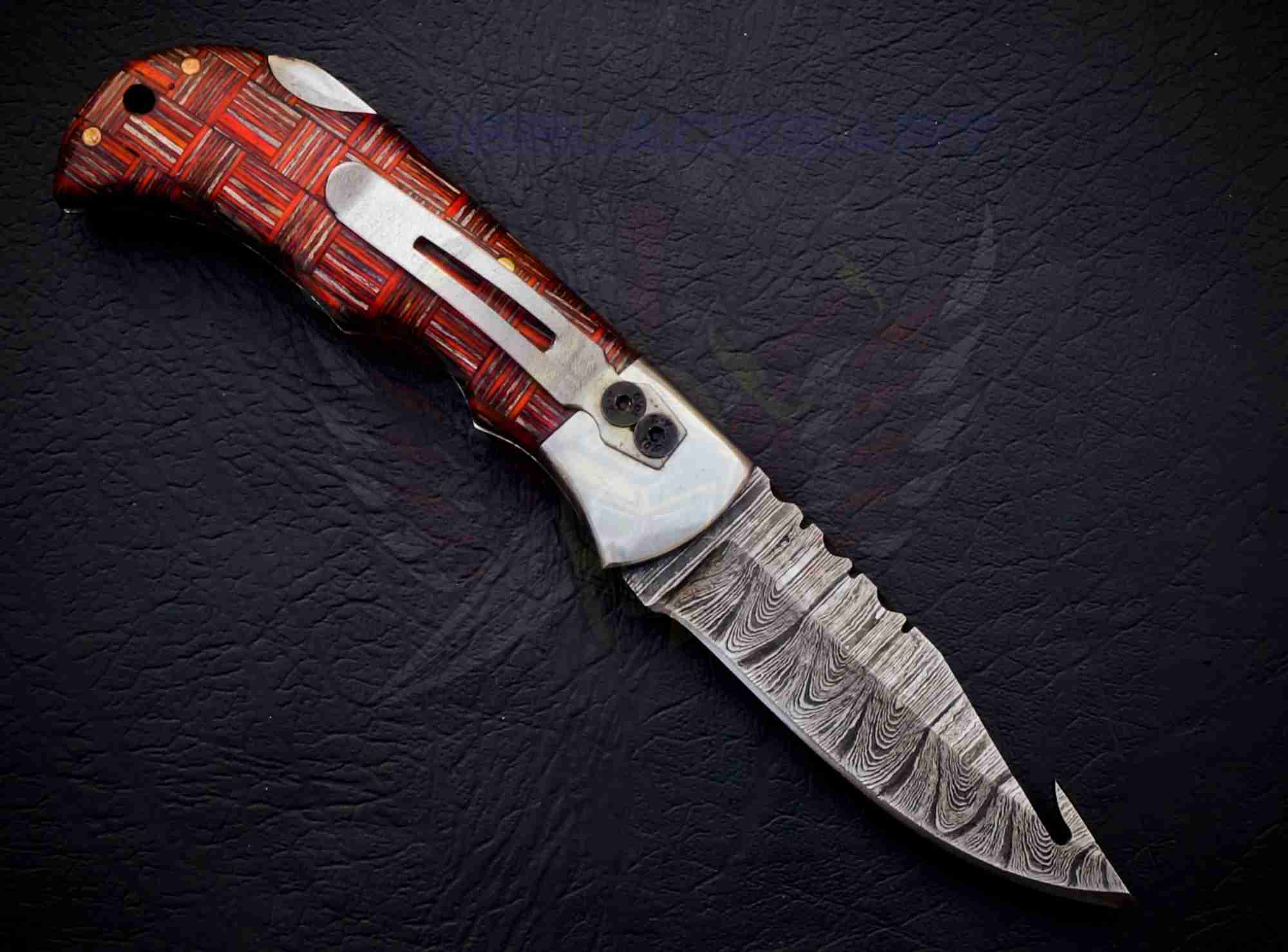 Handmade Redshear Damascus Foldable Pocket Knife featuring a real 1095/15N20 Damascus steel blade with a built-in gut hook and a striking red-and-copper handle.