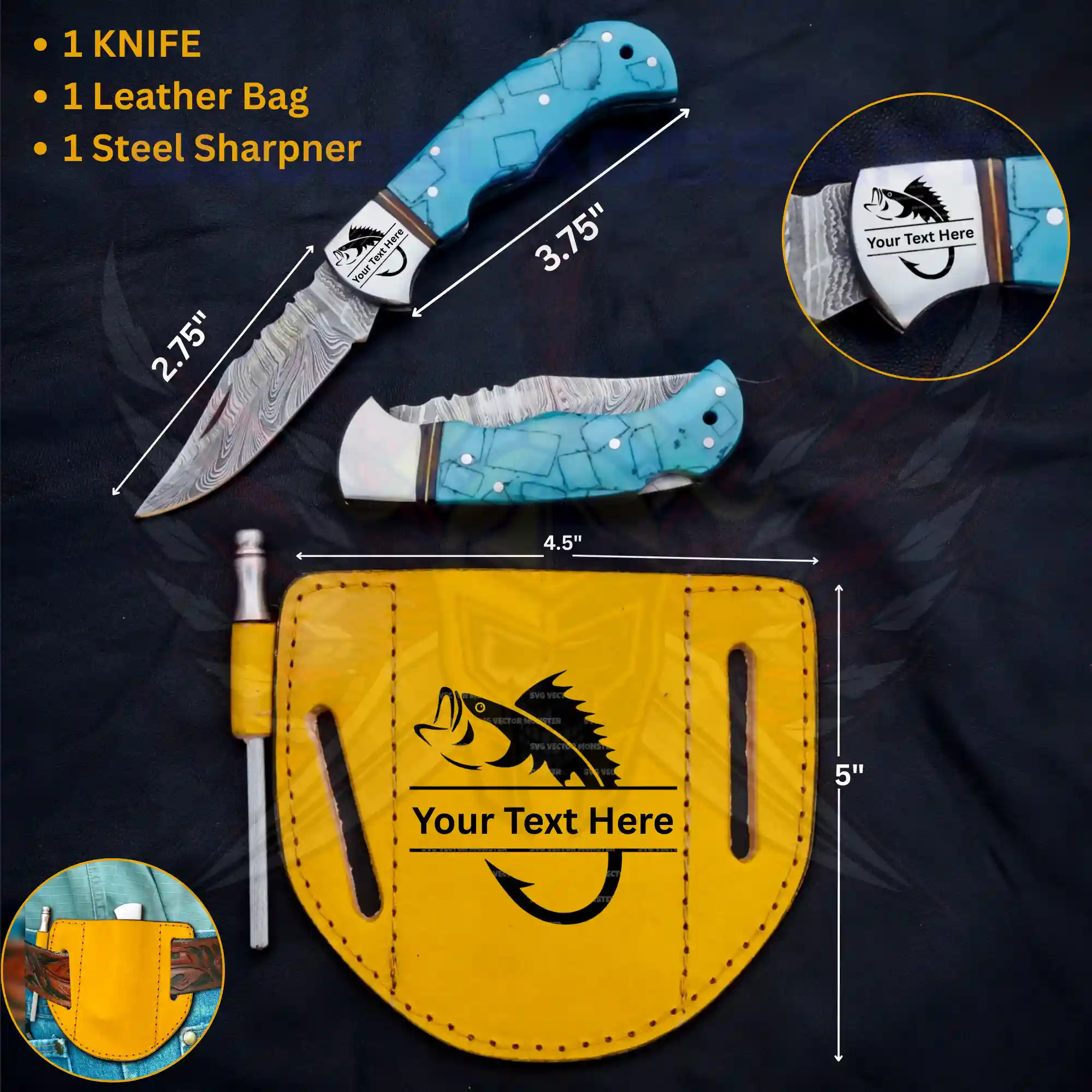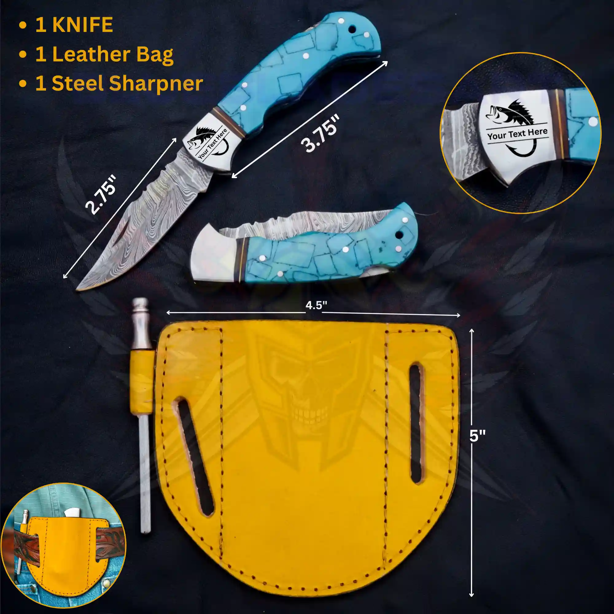 This Turquoise Damascus Foldable Pocket Knife is a compact, handmade knife designed for outdoor use, everyday carry, and collectors. The blade is crafted from real 1095 & 15N20 Damascus steel, known for edge retention and signature wave patterns. Its smooth folding action, secure liner lock, and vibrant turquoise handle make it both functional and stylish.